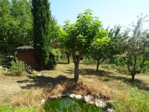Das Grundstück kommt mit ca. 1500 m² auf dem ein Carport, ein Freisitz, ein Gerätehaus, ein kleiner Teich, diverse Obstbäume und ein Gemüsegarten liegt.