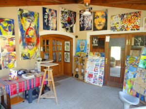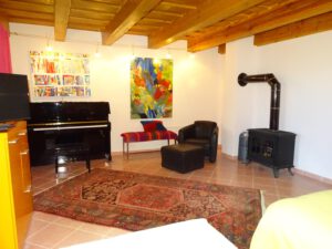 Im Erdgeschoss befindet sich der Eingang, ein Atelier, ein Abstellraum, ein Gang mit Garderobe, ein Schlafzimmer sowie ein Duschbad und ein Weinkeller.