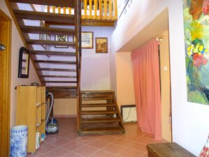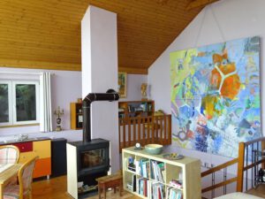 Im Obergeschoss finden Sie ein Wohnzimmer mit Balkon, ein Schlafzimmer, ein Wannenbad und die Küche.