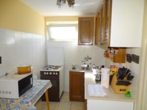 Im Erdgeschoss befindet sich der Eingang, ein Esszimmer, zwei Schlafzimmer, ein Wannenbad sowie ein Gäste WC und eine Küche mit Speisekammer.