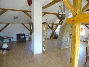Im Obergeschoss mit ca. 85 m² finden Sie einen Vorraum, eine weitere Küche mit Essplatz, ein großes Zimmer mit ca. 63 m² und ein Duschbad.