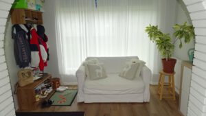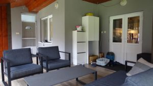 Das Haupthaus hat ca. 120 m² Wohnfläche die sich auf den Eingang, einem Vorraum mit Garderobe, einem Wohnzimmer, zwei Schlafzimmern, einem Esszimmer, einem Gäste WC, einem Dusch- und Wannenbad und einer Küche mit Speisekammer aufteilt.
