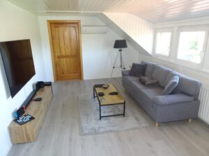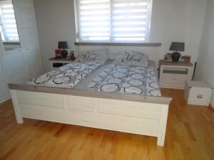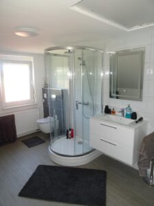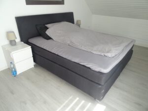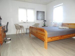 Im Obergeschoss mit ca. 70 m² Wohnfläche finden Sie einen Vorraum, ein Schlafzimmer mit Duschbad sowie ein Wohnzimmer und ein weiteres Schlafzimmer.