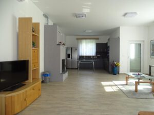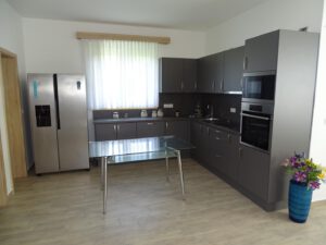 Im Erdgeschoss mit ca. 80 m² Wohnfläche befindet sich der Eingang, eine Garderobe, eine Wohnküche mit Essplatz, eine Wäscheküche sowie die Speisekammer und der Heizraum.