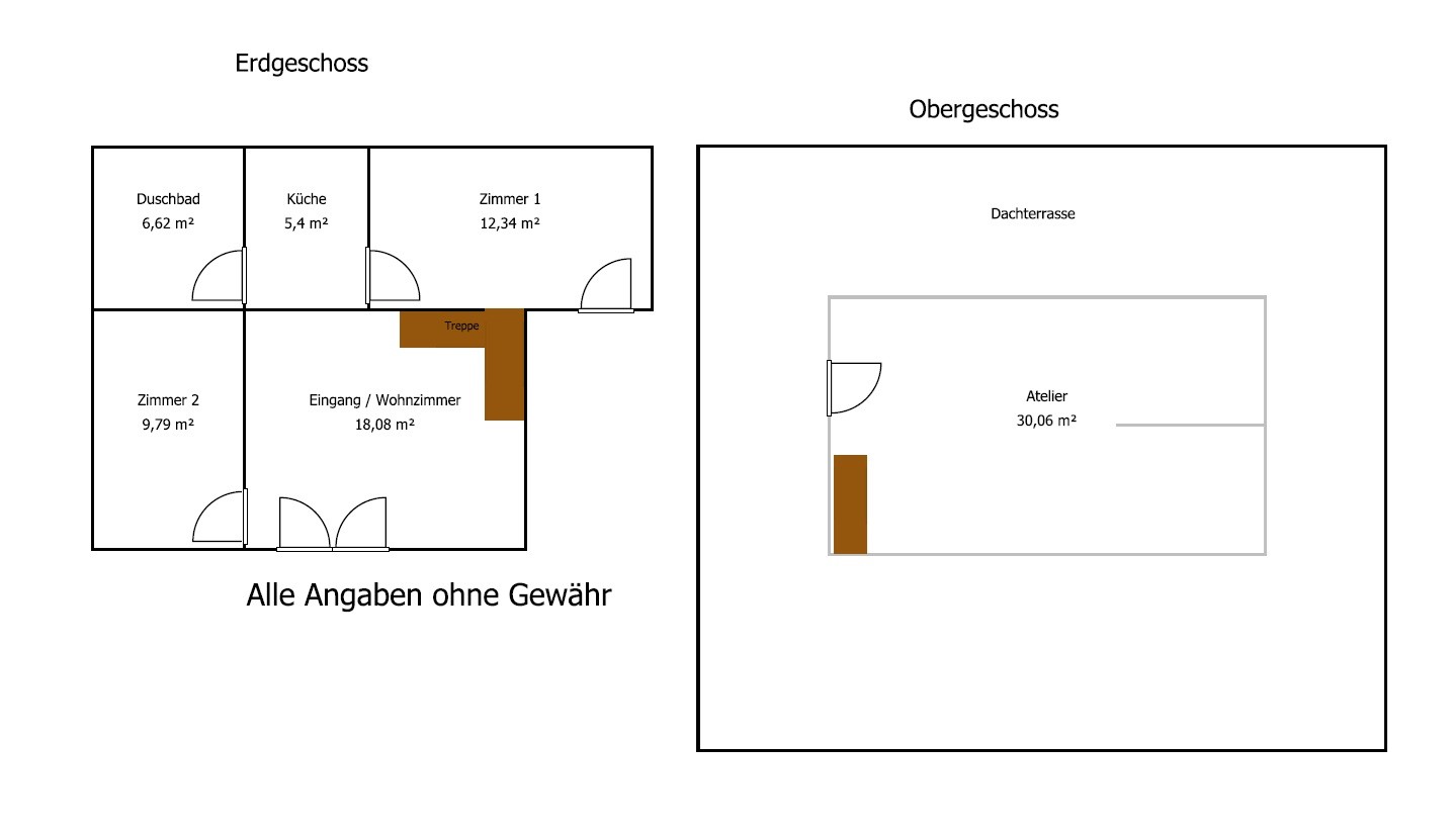 Im Erdgeschoss befindet sich der Eingang, ein Wohnzimmer, zwei Schlafzimmer sowie ein Duschbad und eine Küche.