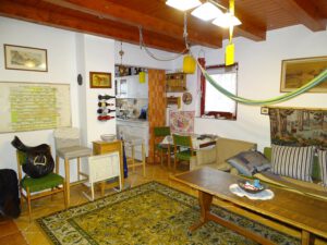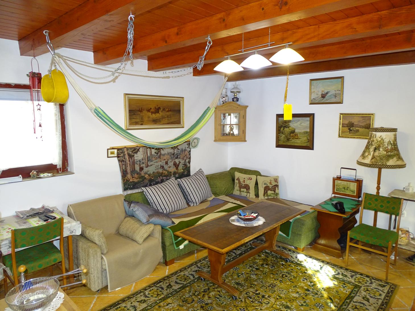 Die Holzbalkendecke gibt dem kleinen Bauernhof seinen eigenen Flair. Auf der Terrasse lassen sich angenehm ruhige Sommerabende im Freien verbringen.