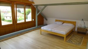 Das Obergeschoss besticht durch eine großzügige, ca. 90 m² große Maisonette-Wohnung, die sich stilvoll über zwei Etages streckt.